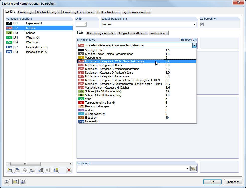 Im Dialog 'Lastfälle und Kombinationen bearbeiten' werden die Lastfälle angelegt und verwaltet sowie die Einwirkungs-, Last- und Ergebniskombinationen erzeugt. Den einzelnen Lastfällen lassen sich die Einwirkungstypen nach der gewählten Norm zuweisen. Wurden einem Einwirkungstyp mehrere Lasten zugeordnet, können diese gleichzeitig oder alternativ (z. B. entweder Wind von links oder Wind von rechts) wirken.