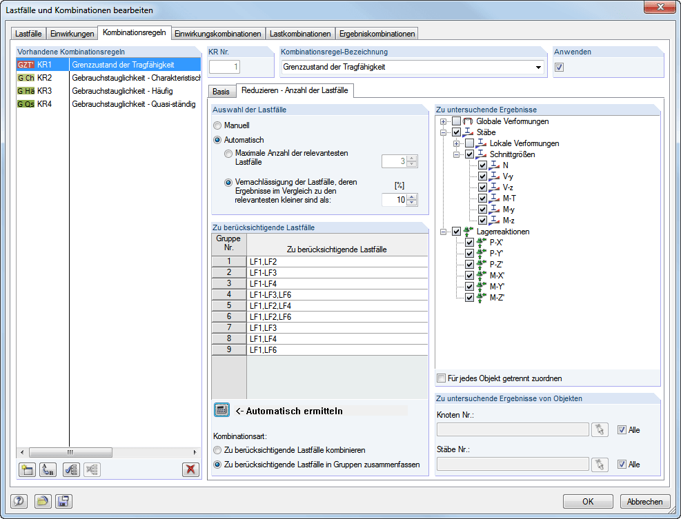Zweitens besteht die Möglichkeit, automatisch generierte temporäre oder benutzerdefinierte Ergebniskombinationen auswerten zu lassen. Danach werden nur die maßgebenden Lastkombinationen erzeugt.