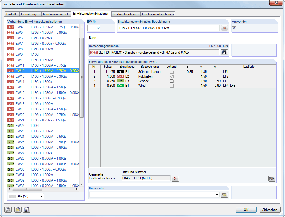 Die Einwirkungen werden automatisch gemäß den Kombinationsregeln überlagert und als so genannte „Einwirkungskombinationen“ ausgewiesen. Es kann festgelegt werden, welche Einwirkungskombinationen letztendlich für die Generierung von Last- bzw. Ergebniskombinationen infrage kommen. Anhand der erzeugten Einwirkungskombinationen lässt sich abschätzen, wie sich die Kombinationsregeln auf die Anzahl der Kombinationen auswirken.