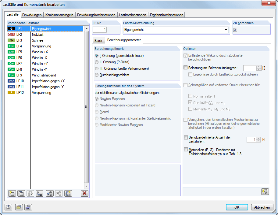 Die Berechnung kann für alle Stabtypen nach Theorie I., II. oder III. Ordnung durchgeführt werden. Diese Wahlmöglichkeit besteht sowohl für Lastfälle als auch für Lastkombinationen. Weitere Berechnungsparameter sind individuell für die Lastfälle, Last- und Ergebniskombinationen einstellbar. Damit ist eine hohe Flexibilität in Bezug auf das Berechnungsverfahren und die Detailvorgaben gewährleistet.