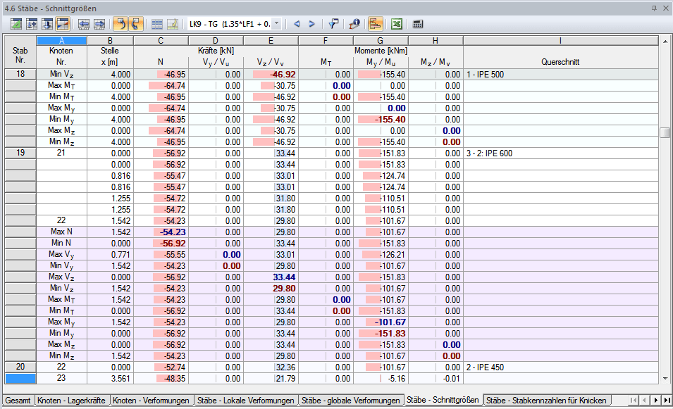 In den Ergebnistabellen wird farblich dargestellt, ob positive oder negative Schnittgrößen vorliegen und welche Relation zu den Extremwerten besteht. In den Ergebnistabellen der Bemessungsmodule werden durch die Farben die jeweiligen Ausnutzungsgrade ausgedrückt. Die maßgebenden Bemessungsstellen sind damit sofort ersichtlich.