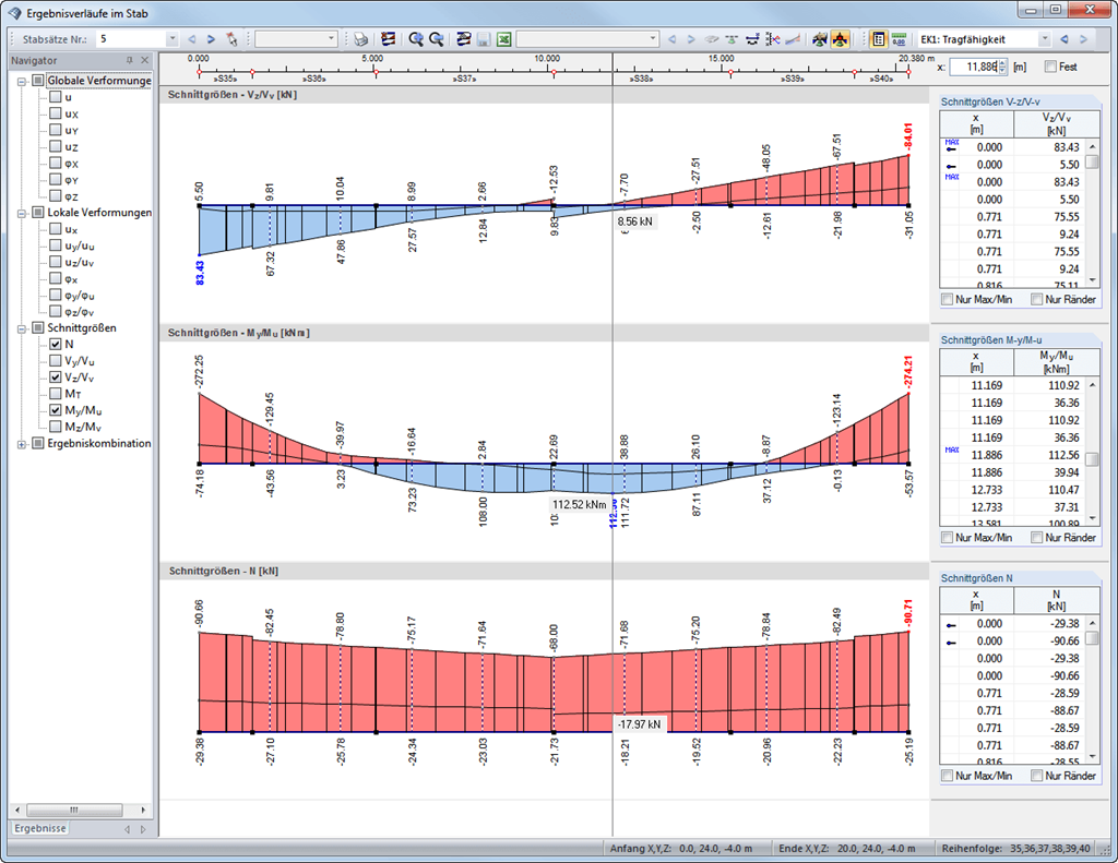 Die Ergebnisverläufe von Stäbe, Flächen und Lagern sind frei konfigurierbar. Es lassen sich Glättungsbereiche mit Durchschnittswerten definieren oder Ergebnisverläufe je nach Bedarf ein- oder ausblenden. Dadurch ist die gezielte Auswertung der Ergebnisse sichergestellt. Alle Diagramme können in das Ausdruckprotokoll übernommen werden.