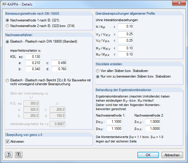 - Bei Bemessung einer Ergebniskombination ergibt sich aufgrund der Ergebnisüberlagerung an jeder Stabstelle eine Ergebnisschar, was eine eindeutige Ermittlung der Momentenbeiwerte unmöglich macht. In diesem Abschnitt kann daher für eine Ergebniskombinationsbemessung ein globaler Momentenbeiwert frei vorgegeben werden. Die vordefinierten Werte liegen unabhängig von der Bemessungsmethode auf der sicheren Seite.