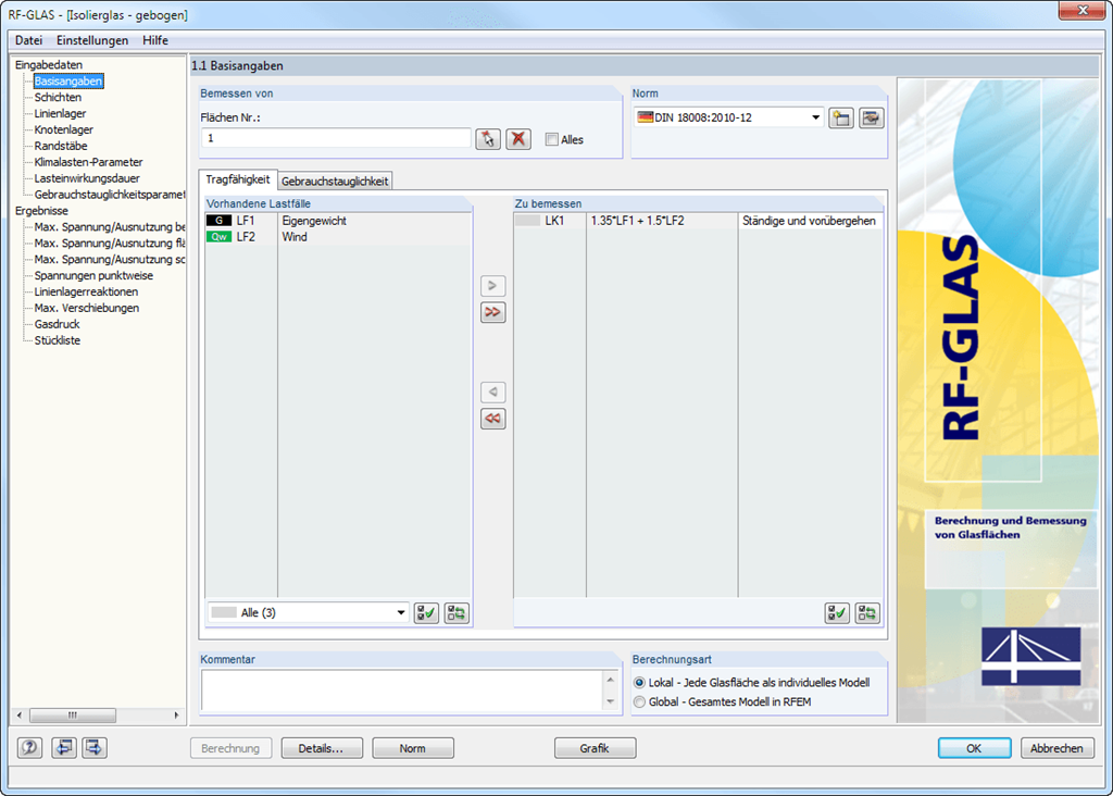 Anschließend ist zu entscheiden, ob die Berechnung ohne den Einfluss der Umgebungsstruktur (lokale Berechnung) oder unter Berücksichtigung dieses Einflusses (globale Berechnung) stattfinden soll. Wird die Berechnungsart Lokal eingestellt, so wird jede für die Bemessung ausgewählte Fläche vom Modell abgelöst und einzeln berechnet.