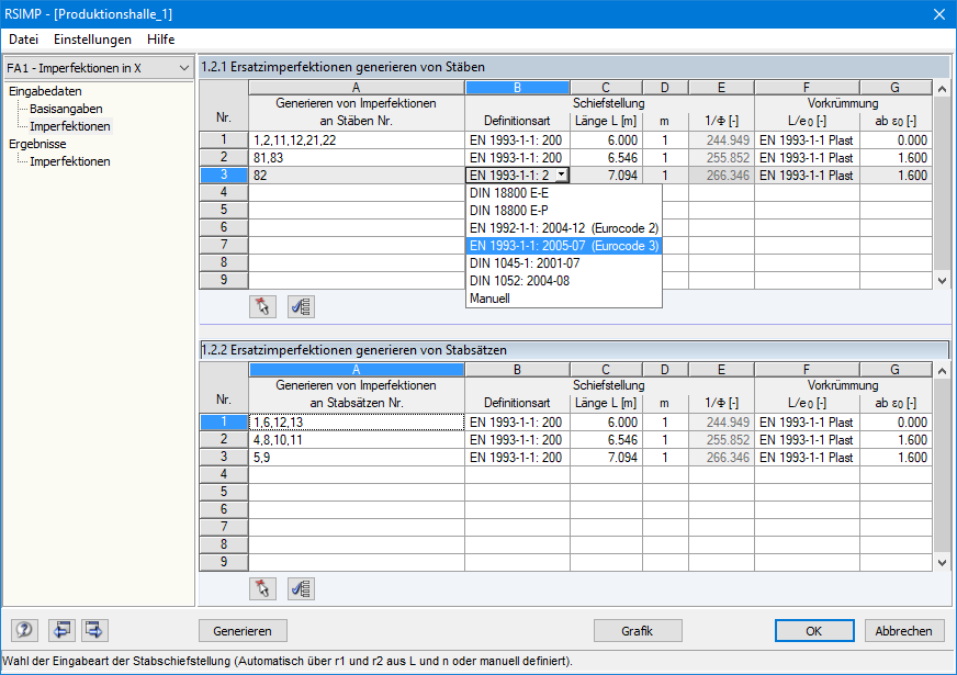 Ersatzimperfektionen eignen sich für Stabwerke. In einer zusätzlichen Maske sind die Schiefstellungen und Vorkrümmungen von Stäben und Stabsätzen zu definieren. Sie können entweder automatisch nach Normen erzeugt oder manuell definiert werden. Folgende Normen stehen zur Auswahl: