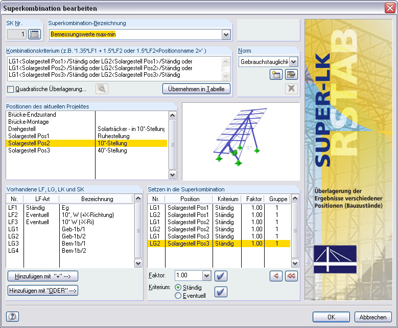 Das Kombinationskriterium legt fest, welche Lastfälle, Last- oder Ergebniskombinationen von welcher Position zu berücksichtigen sind. Die Einwirkungen können mit Faktoren skaliert und als 'ständig' oder 'eventuell' klassifiziert werden. Es sind auch Alternativbetrachtungen in Form einer 'oder'-Überlagerung möglich. Die Zuordnung der Positionen wird durch Grafiken erleichtert.