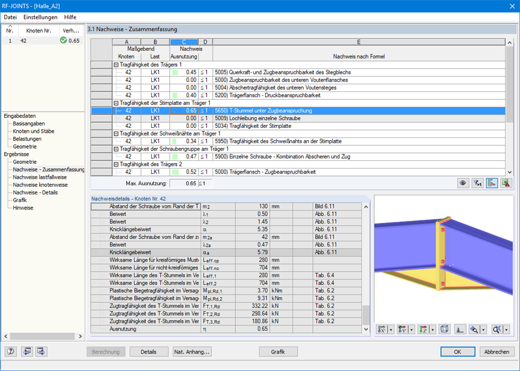 Bei Auswahl eines Nachweises werden detaillierte Zwischenergebnisse einschließlich der Einwirkungen und zusätzlichen Schnittgrößen aus der Anschlussgeometrie eingeblendet. Zusätzlich besteht die Möglichkeit, sich die Ergebnisse lastfallweise und knotenweise anzeigen zu lassen. Das 3D-Rendering ist eine wirklichkeitsgetreue und maßstäbliche Darstellung der Verbindung. Neben den Hauptansichten kann die Grafik aus jeder beliebigen Perspektive betrachtet werden.