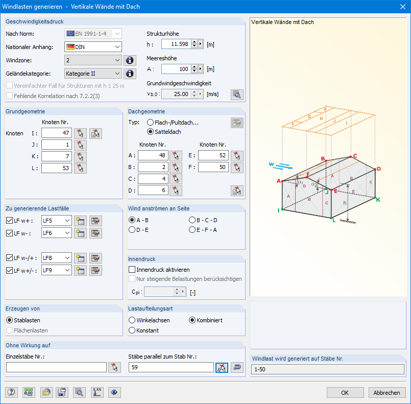 Auf folgende Bauteile können automatisch Windlasten (optional mit Innendruck für offene Gebäude) als Stablasten bzw. Flächenlasten generiert werden: