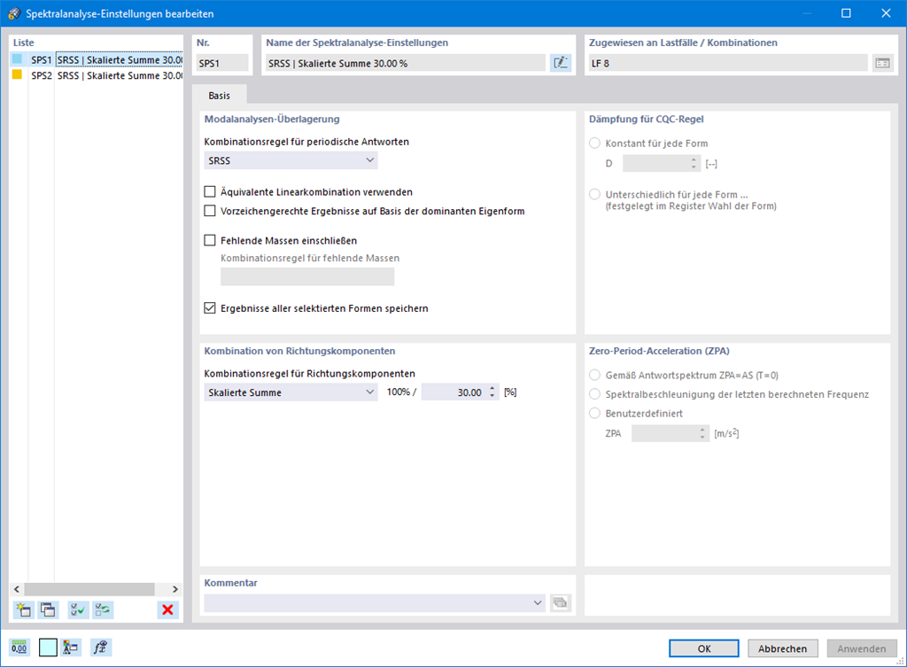 Lastfälle vom Typ Antwortspektrenverfahren definieren, in welche Richtung Antwortspektren wirken und welche Eigenwerte der Struktur relevant für die Analyse sind. In den Spektralanalyse-Einstellungen legen Sie Details für die Kombinationsregeln, ggf. Dämpfung sowie Zero-Period-Acceleration (ZPA) fest.