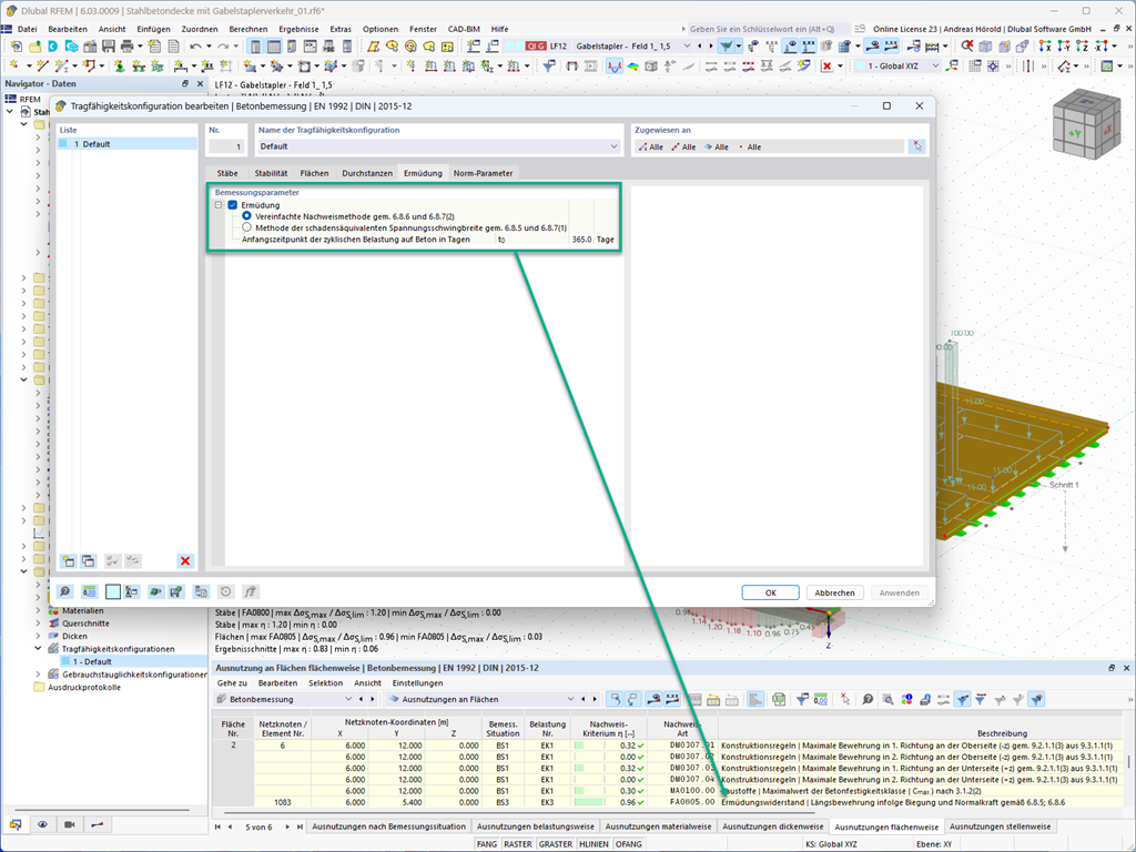 Mit dem Add-On Betonbemessung können Sie für Stäbe und Flächen den Ermüdungsnachweis nach EN 1992-1-1, Kapitel 6.8 führen.