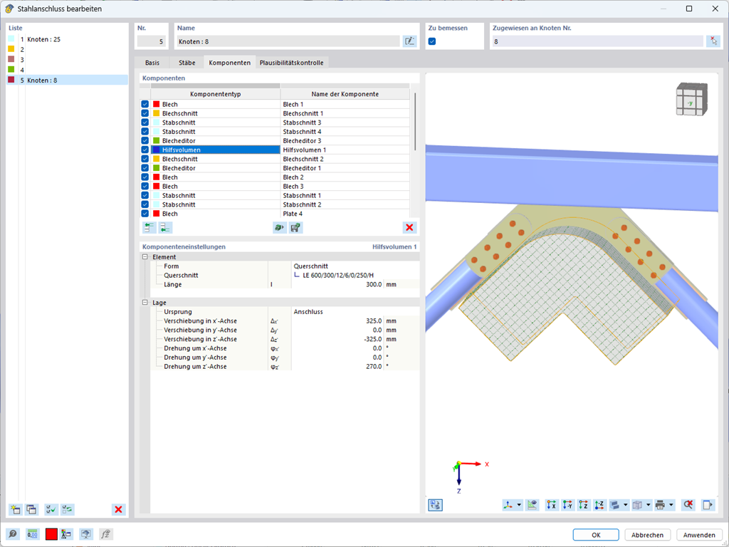 Im Add-On Stahlanschlüsse können Sie mit Hilfe der Komponente "Hilfsvolumen" präzise Schnitte an Platten und Bauteilen ausführen. Innerhalb dieser Komponente lassen sich die Formen Kasten, Zylinder oder ein beliebiger Querschnitt als Hilfsobjekt verwenden.
