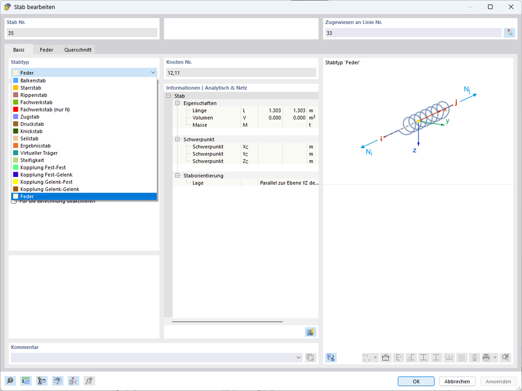 Der Stabtyp "Feder" dient der Simulation von linearen und nichtlinearen Federeigenschaften über ein lineares Objekt. Diese Eingabefunktion hilft Ihnen dabei, Steifigkeitsvorgaben in der Einheit Kraft/Weg im Modell umzusetzen.