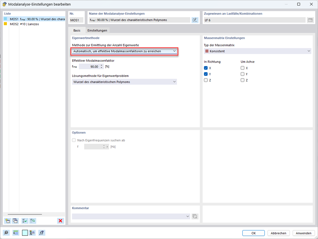 Im Add-On Modalanalyse steht Ihnen die Option zur automatischen Erhöhung der gesuchten Eigenwerte bis zur Erreichung eines definierten effektiven Modalmassenfaktors zur Verfügung. Es werden dabei alle translatorischen Richtungen berücksichtigt, welche für die Modalanalyse als Massen aktiviert wurden.