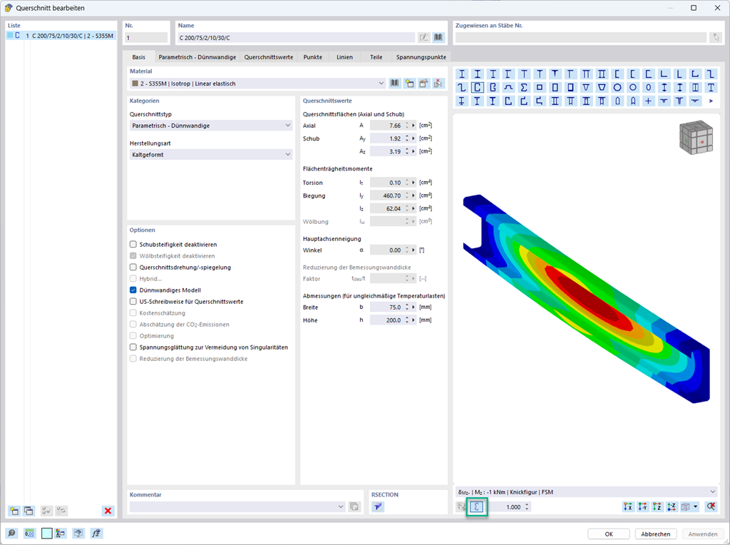 Im Dialog "Querschnitt bearbeiten" können Sie sich die Knickfiguren der Finite-Streifen-Methode (FSM) als 3D-Grafik ausgeben lassen.