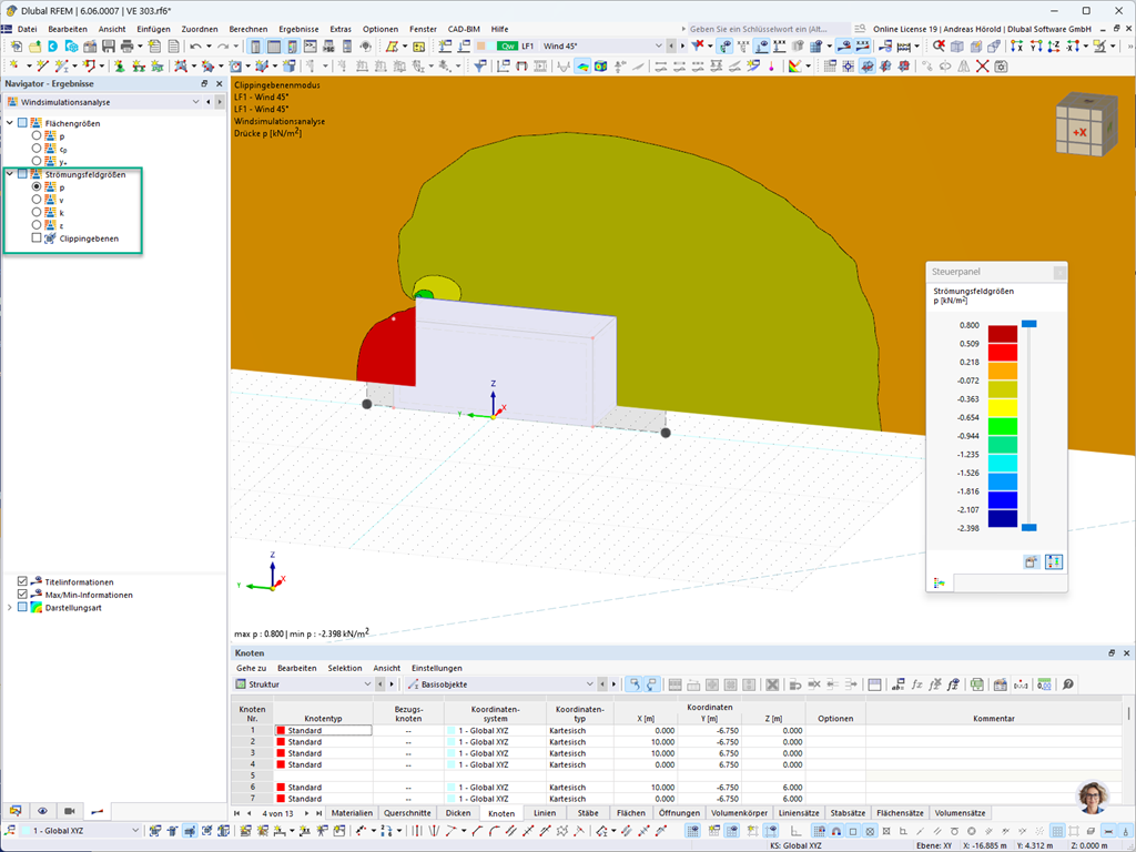 In RFEM und RSTAB haben Sie die Möglichkeit, sich für die Windsimulation die Strömungsfeldgrößen Druck, Geschwindigkeit, kinetische Turbulenzenergie und Turbulenzdissipationsrate visualisieren zu lassen.