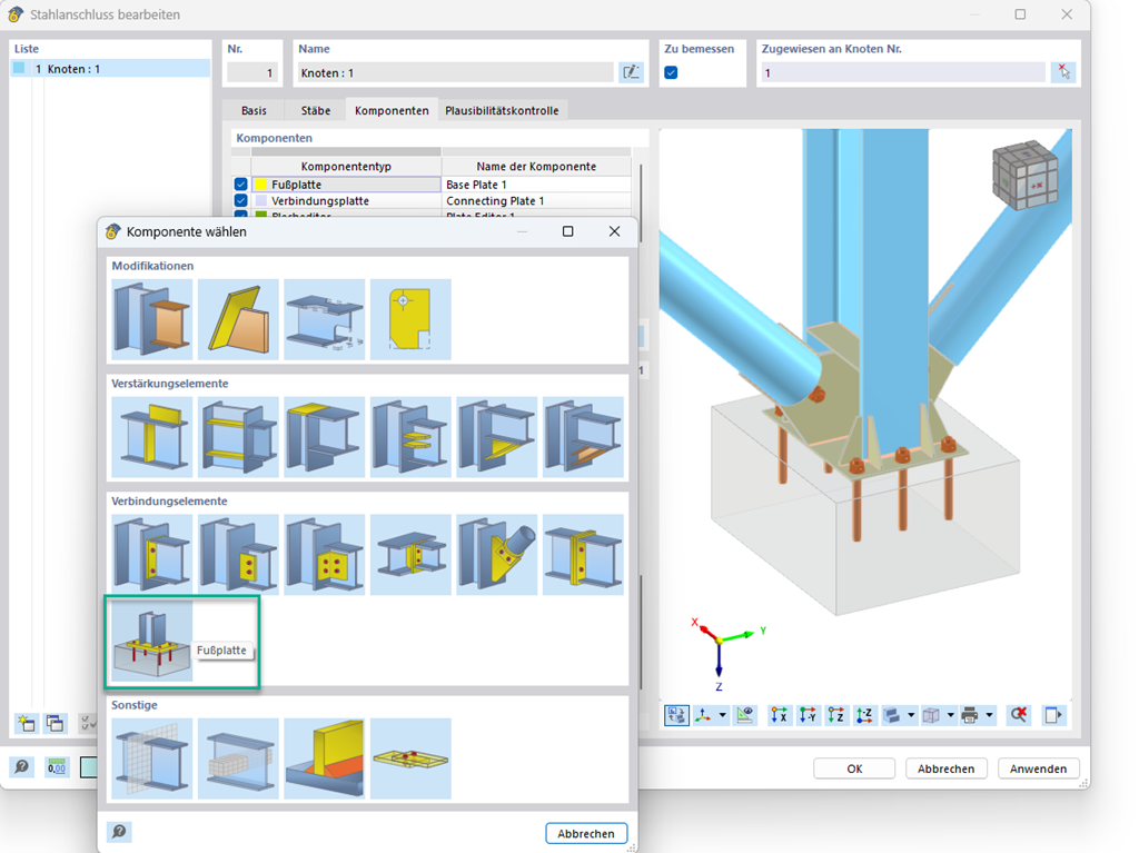 Mit der Komponente "Fußplatte" bemessen Sie Fußplattenanschlüsse mit einbetonierten Ankern. Dabei werden Platten, Schweißnähte, Verankerung und Stahl-Beton-Interaktion analysiert.