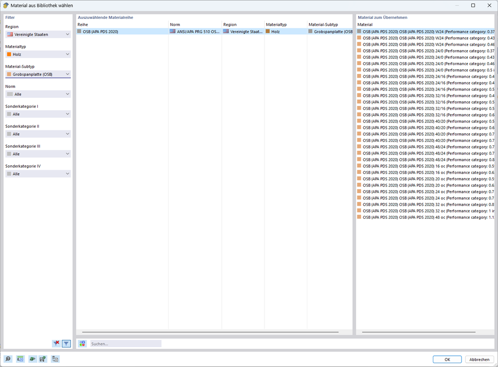 In RFEM ist OSB-Material für die USA und Kanada verfügbar. Es werden die Materialparameter vom "Panel Design Specification manual" übernommen.