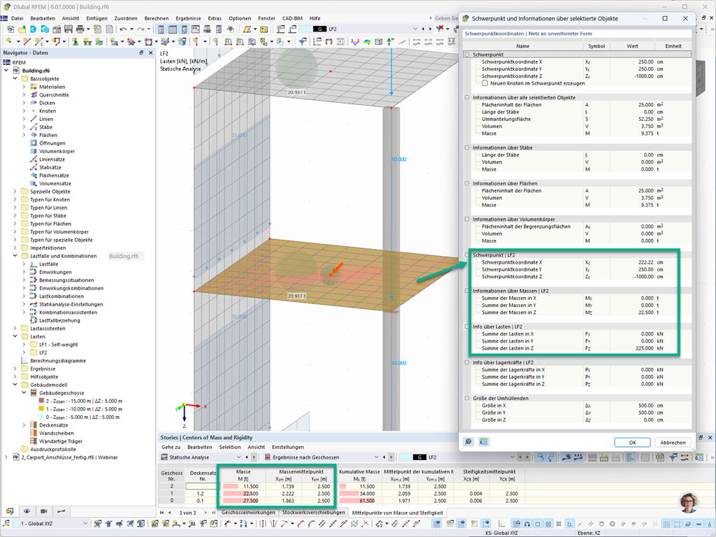 Außerdem können Sie sich über den Dialog 'Schwerpunkt und Informationen über selektierte Objekte“ den Schwerpunkt unter Berücksichtigung der ausgewählten Belastung ausgeben lassen.