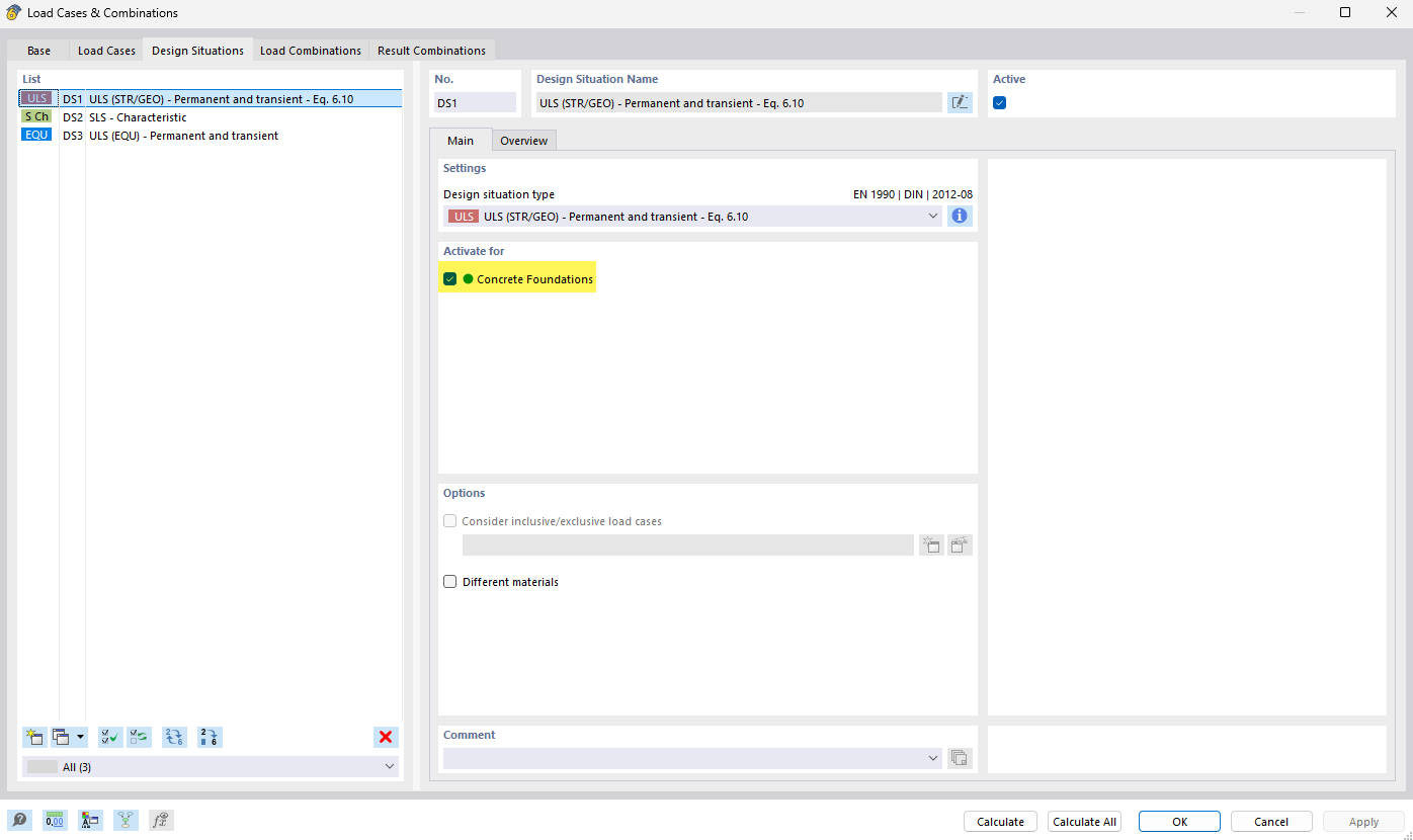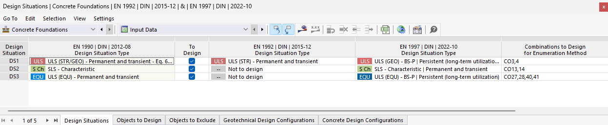 The Design Situations table in the “Concrete Foundations” category lists all design situations defined for the model. Two standards are relevant for assigning design situation types for concrete foundations: