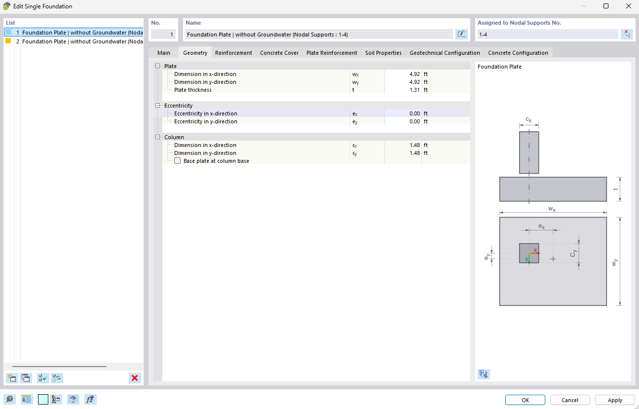 In the Geometry tab, you can define dimensions of the foundation plate.