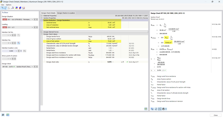 If a member local section reduction was taken into account in the design, the corresponding intermediate values are displayed under Design Check Details.