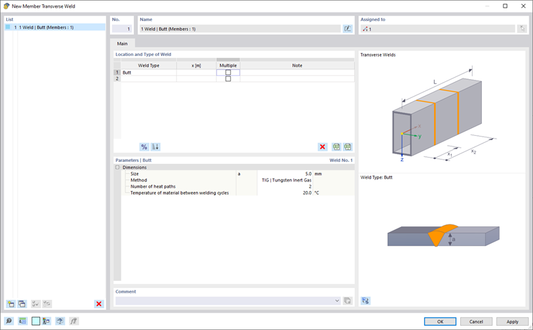 There are fillet and butt welds available as weld types for selection. You can define the transverse welds for different locations along a member or a member set. For this, a specific location is defined by using an absolute or relative entry. You can also use the