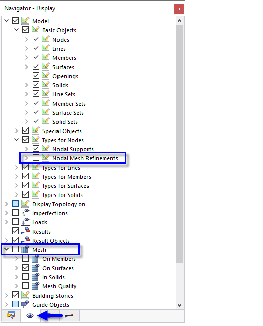buttons on the toolbar. Furthermore, turn off the symbols of the mesh refinements and the mesh: Open the Navigator - Display by clicking the