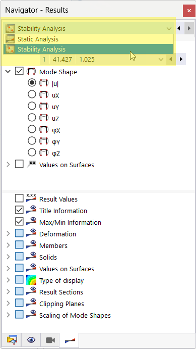 The image shows the buckling shape of a cantilever, displayed as part of a Structure Stability analysis. It shows how a cantilever can deflect under critical load conditions. In addition, a result category of the stability analysis performed is highlighted. The display illustrates technical aspects, such as the deformation processes and critical states of a cantilever.