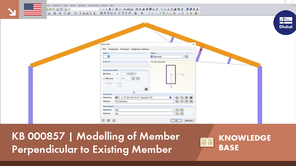 For a frame trussed from below, the compression members are to be modeled perpendicular to the inclined beam. The member length and the intersection with the horizontal beam are defined.