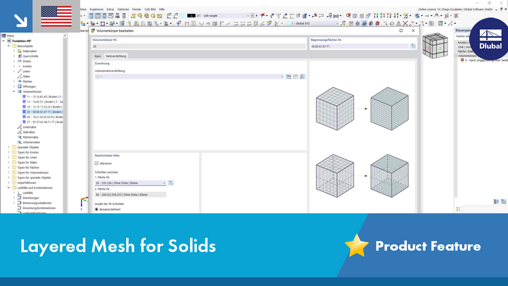 Would you like to mesh solids? Here you have the option of arranging a layered FE mesh. This option allows you to perform a defined division of the solid with finite elements between two parallel surfaces. Try it now!