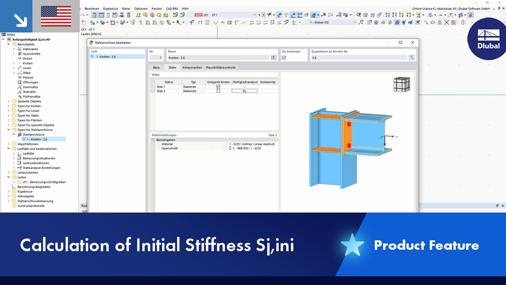 In the Steel Joints add-on, you can determine the initial stiffness Sj,ini according to Eurocode and AISC. This can be done for the selected members with reference to the internal forces N, My, and Mz.