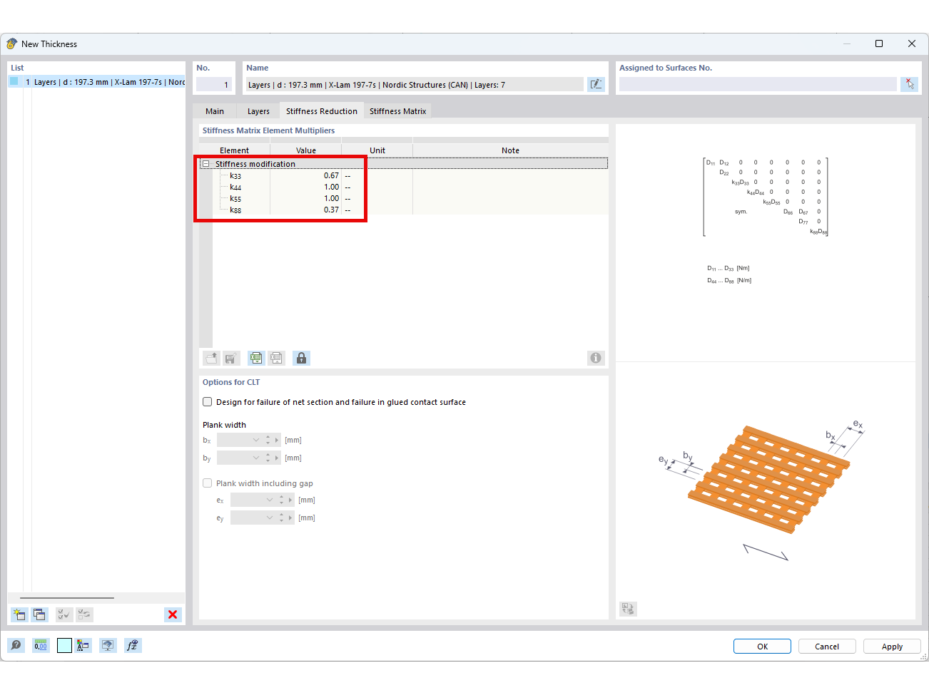 These factors reduce the torsional stiffness D33 as well as the shear stiffness D88 of the corresponding stiffness matrix elements of a surface. Since cross-laminated timber is generally not glued at the narrow side, no shear stresses can be transferred to the narrow sides of the timber. Thus, the stiffness would be overestimated in this case. For this reason, the stiffness must be reduced accordingly.