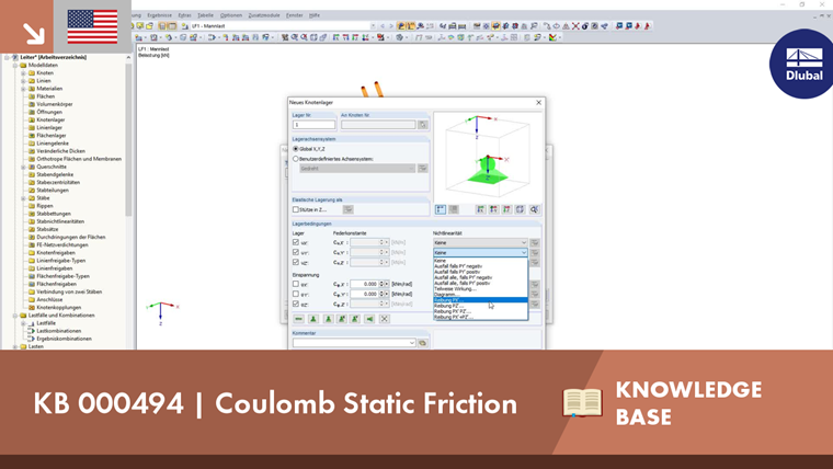 Since the shear force resistance between two elements has an influence on the force play in the entire model, RFEM and RSTAB allow a static friction coupling to support, hinge, and release definitions. This approach simulates the friction using an automated iterative calculation process that checks the static friction conditions after each iteration and applies the appropriate measures to maintain the equilibrium. The function was designed in such a way that the user directly specifies the coupling degrees of freedom in the direction in which the frictional force runs and from the direction the compressive force comes.