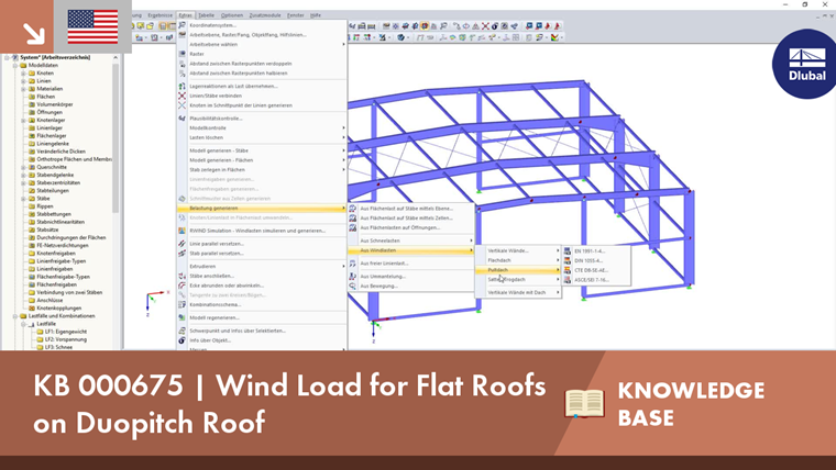 For applying wind loads to roofs, the RFEM 5 or RSTAB 8 analysis program provides a generator for pitched gable roof shapes and planar flat roof shapes. The special case of a gently pitched gable roof shape smaller than 5 degrees is recognized by the load generator for duopitch roof shapes. In this situation, the generator applies a load specification for an equivalent flat roof.