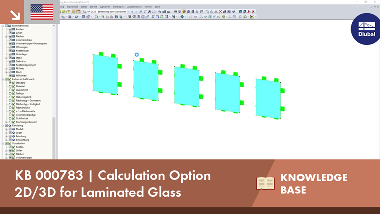 For designing glass in the RF‑GLASS add‑on module, you can use one of two calculation methods: a 2D or a 3D calculation. The main difference between these design options is the automatic modeling of the layers in a temporary model. In a 2D calculation, each layer is generated as a surface element (plate theory); in a 3D calculation, it is generated as a solid. Depending on the selected layer composition, you can either select an option or find it preselected by the program.