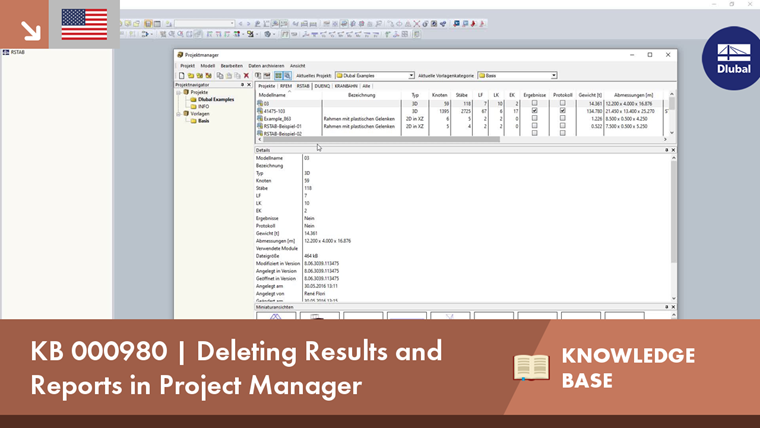 In order to eliminate problems caused by the result data or report information that are no longer readable, you can delete the data in the Project Manager without opening the corresponding project. Structural data, loads, and defined combinations remain preserved.