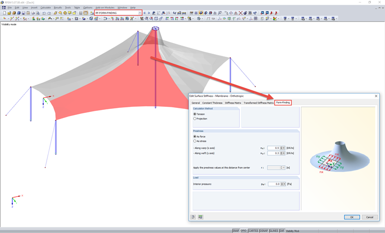 After a successful meshing, the program starts the FF process. This process adopts the mesh geometry and surface stress/prestress entered initially, and displaces the position of the mesh elements until the surface stress on the FE element is in equilibrium with the boundary conditions. The description of the surface stress on the membrane mesh elements can be defined in two ways.
