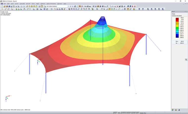 The "RF‑FORM‑FINDING" load case represents a new model configuration with the surface stress/prestress. A subsequent calculation with a specific surface load input, such as wind load, then uses the model described under the load case "RF‑FORM‑FINDING" as the initial configuration, with all the associated effects. In the case of these subsequent load cases, the deformation applies to the previously determined equilibrium shape.