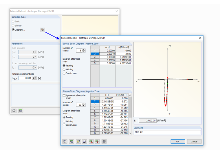 The stress-strain curve is generally entered in RFEM. The compression and tension areas can be defined individually using the "Diagram …" option. Only the elastic modulus at the origin must be identical to the respective subsequent points in the compression and tension areas. The reference element size lFE,R is left unchanged, with a length of 0.0 m. Thus, it is ensured that the defined stress-strain curve is applied 1:1 in the damage zone in the calculation. Image 09 shows the input of the analyzed steel-fiber-reinforced concrete in the input window of RFEM.