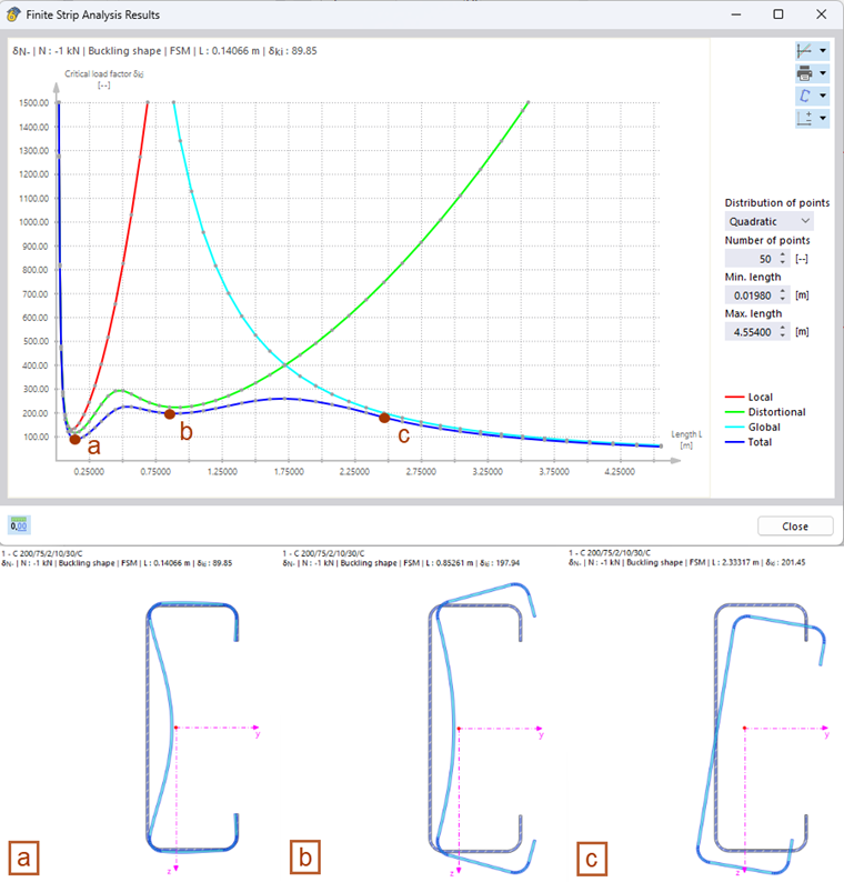 The cross-section deformations associated with a calculated critical load can be seen in the cross-section graphic. By default, the mode shape that belongs to the first local minimum of the critical load curve is displayed. By "clicking" any data point in the diagram, the display is automatically updated. The mode shapes shown in Image 4 clearly show the influence of the respective stability modes on the determined critical load. While the local buckling dominates in point a, the mode shape in point b is characterized by distortional buckling. In point c, however, a rigid body motion of the cross-section can be seen, which is associated with the global stability failure (here, it is lateral and flexural torsional buckling).