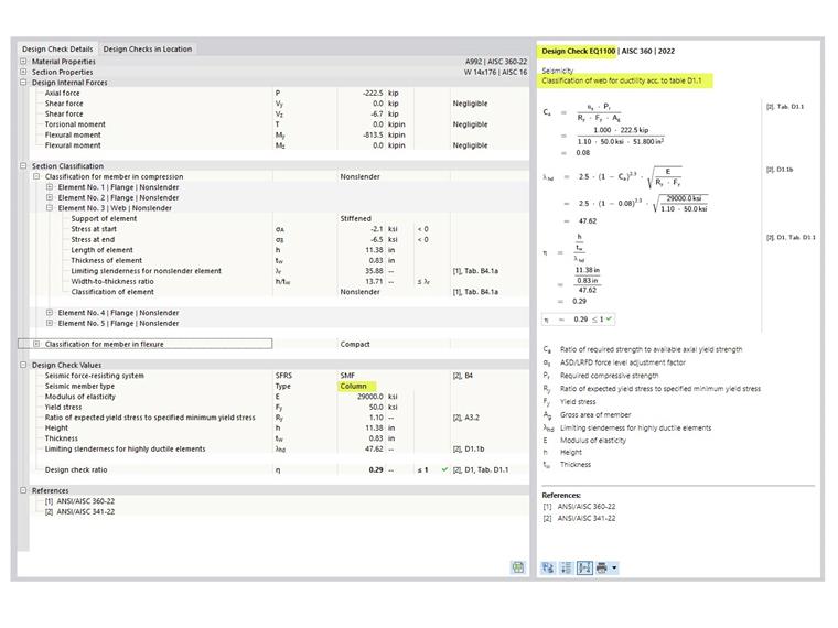The limiting width-to-thickness ratio for webs of highly ductile members is determined using the governing load case for axial load, as stipulated in Section D1.4a [1]. The governing load case is based on all load combinations, including gravity only CO, CO with standard seismic load, and CO with overstrength seismic load. This check is shown in EQ 1100 in RFEM (Image 2).