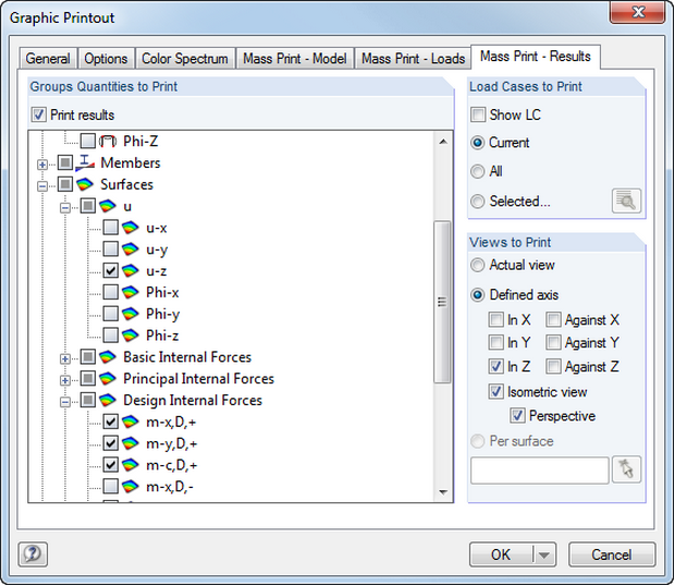 It is possible to print a model, loads, and results in a series. Graphics can be created on the basis of different directions to be specified. For example, you can print all internal forces as an isometric view with a single mouse‑click.
