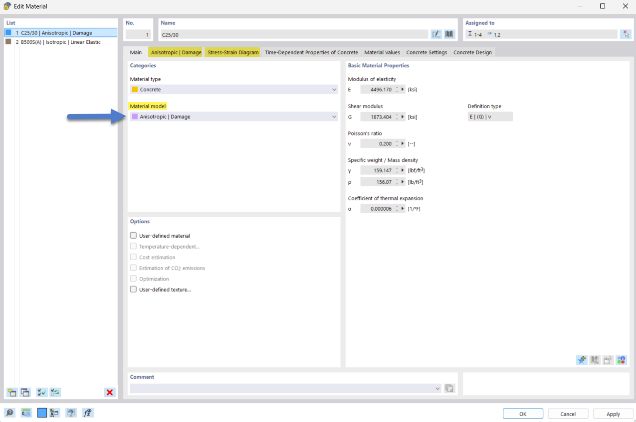 Si el complemento Comportamiento no lineal del material está activado en los datos básicos, se puede configurar el modelo de material "Anisotrópico | Daño" para el material de hormigón. Este es adecuado para representar el comportamiento no lineal del hormigón armado. Una vez configurado el modelo de material, se muestran las dos pestañas específicas "Anisotrópico | Daño" y "Diagrama Esfuerzo-Deformación". Esto se destaca en la imagen siguiente.