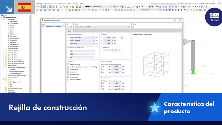 Las cuadrículas de construcción personalizadas facilitan la modelación de estructuras de viguetas o rejillas. Los puntos de intersección de una cuadrícula plana o espacial de líneas ofrecen puntos de definición para nodos y barras. Puede utilizar la cuadrícula de construcción para colocar objetos cuando la captura de objetos esté activada con la opción 'Cuadrícula de construcción' (ver capítulo Objeto de captura). Esto también se puede controlar rápidamente con el botón