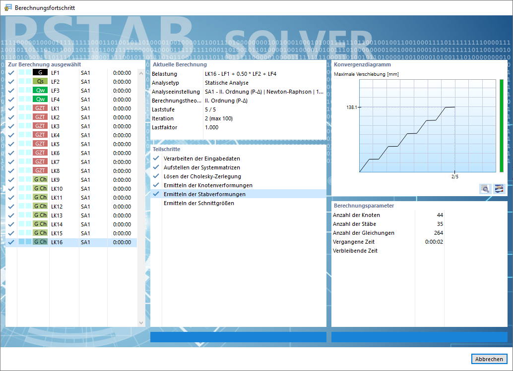 El proceso de cálculo se muestra en la ventana 'Progreso de cálculo'. En el 'Diagrama de convergencia', también puede observar los progresos de los desplazamientos máximos junto a los pasos de cálculo anteriores.