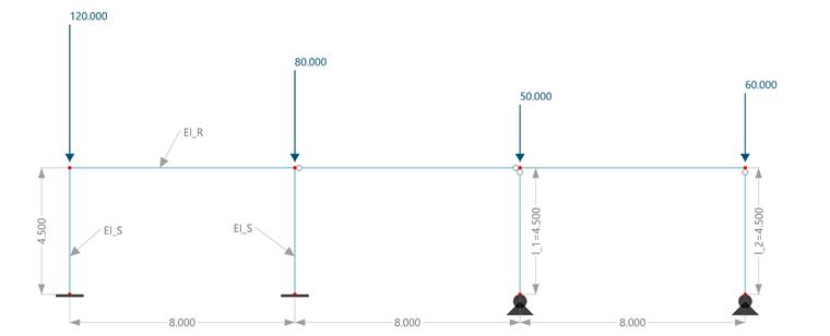 Un pórtico coaccionado con dos pilares articulados adicionales está cargado con cargas puntuales verticales. Se debe calcular el factor de carga crítica determinante para el sistema estructural y se deben determinar las longitudes eficaces respectivas para los montantes del pórtico coaccionado.