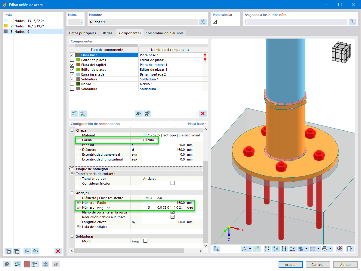 Característica 002924 | Disposición circular de los puntos de anclaje en una placa base | Unión de acero, disposición de los pernos, circular