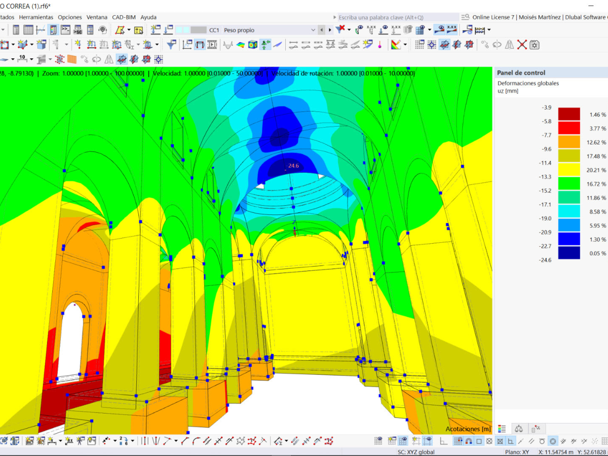 La imagen muestra una vista interna de una iglesia sometida a un análisis estructural que evalúa deformaciones globales bajo carga propia. La bóveda y los pilares presentan distintos niveles de desplazamiento, representados a través de una escala de colores. Se incorporan aspectos de interacción suelo-estructura, modelado numérico, cimentación y refuerzo estructural. El sistema RFEM se utiliza para simular el comportamiento complejo de la estructura y obtener una evaluación precisa de los desplazamientos. URL de referencia: https://www.dlubal.com/es/img/55292