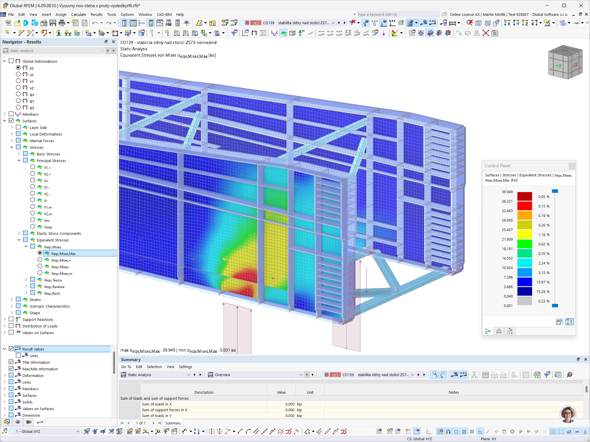 Na obrázku je zobrazen ocelový výsuvný nos mostní estakády, který je součástí modelu vytvořeného v RFEM software. Tento model znázorňuje srovnávací napětí ve stěně nosu, které bylo zjištěno pomocí nelineárního výpočtu. Výpočetní model vytvořili Ing. Petr Nečesal, Ing. David Marván a společnost PIS PECHAL, s.r.o.
