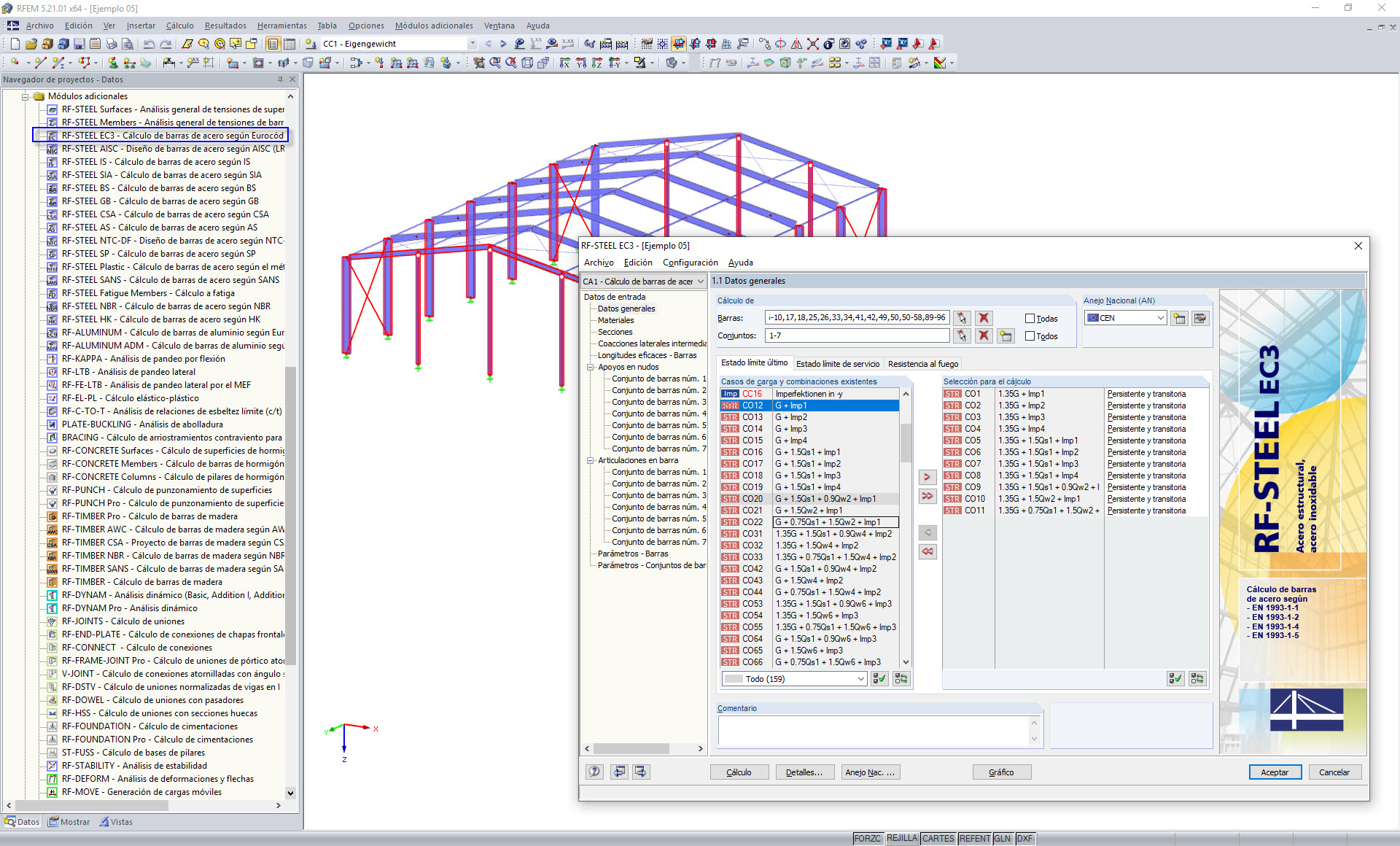 Die Hauptprogramme können auch mit Zusatzmodulen wie RF-/DYNAM Pro oder RF-BEWEG erweitert werden, die den Funktionsumfang vergrößern. La mayoría de los módulos adicionales tiene su propia interfaz gráfica del usuario, donde se tienen en cuenta las condiciones específicas de la norma.